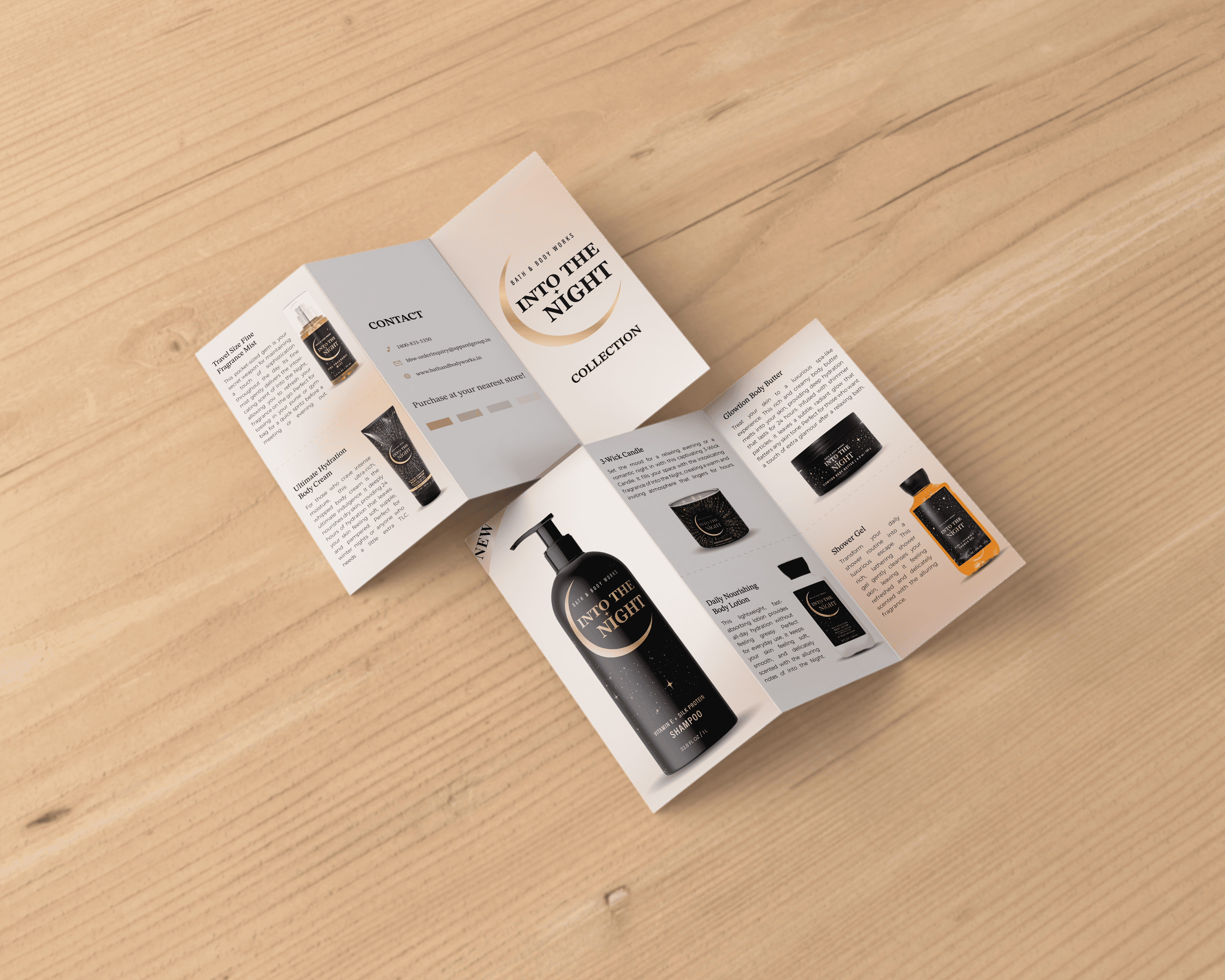 I was tasked with launching a new shampoo product, "Into the Night," for the existing brand Bath & Body Works. I designed a product and created a campaign that aligned with the brand's identity. The campaign included social media ads, a web banner, a voucher, a brochure, a poster, and a newspaper ad with a free sample.